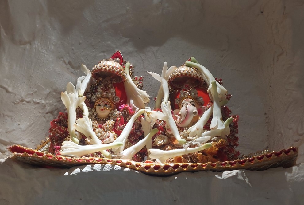 財富女神拉克希米以母親的身份,坐在象神迦尼薩的右側。