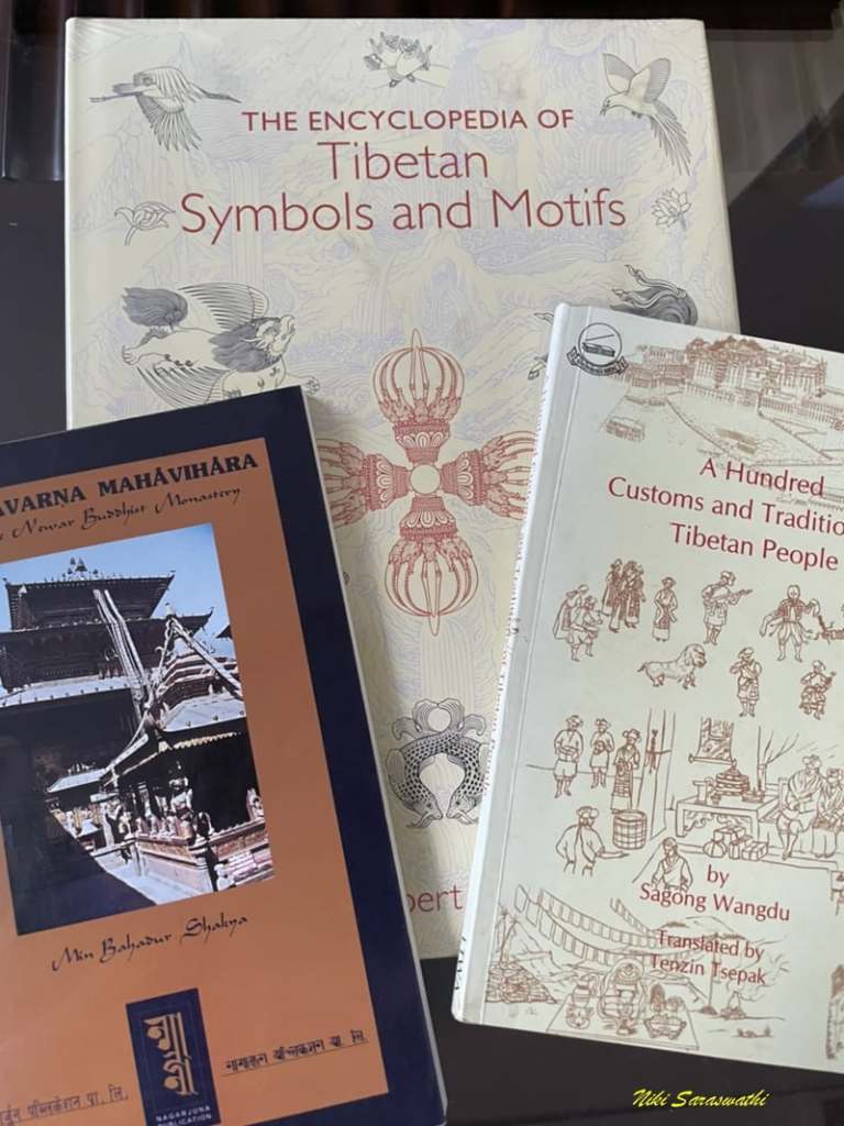 (右)在達蘭薩拉買到的藏書:西藏文化與民俗相關的書,以及難得看到的尼泊爾傳統建築的書籍