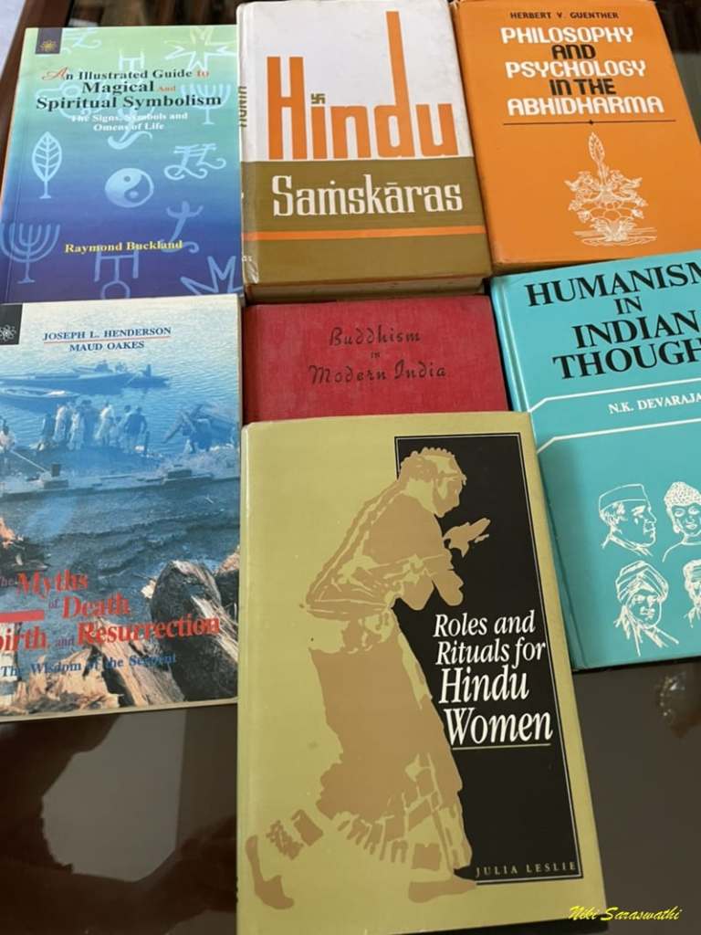 (右下)為瓦拉納西書店購得的印度宗教, 神秘學, 哲學, 佛教思想, 女性於傳統印度儀式中扮演的角色等等書籍。
