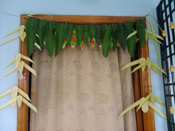 (圖左:維基CC)印度教的家庭庭院中央,設置一株聖羅勒,是為吉祥、庇護、繁榮的代表。(圖右:維基cc)以芒果葉為門簾,除了吉祥豐盛之意,科學上來說,芒果葉能夠攜帶大量氧氣,有助於室內空氣清新。
