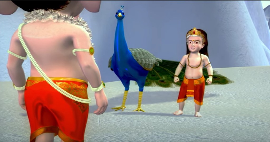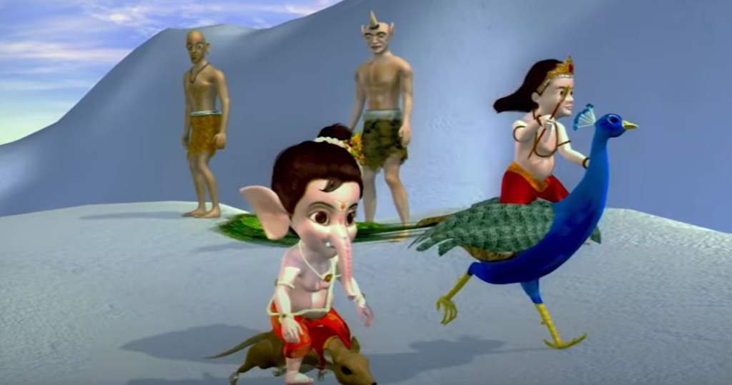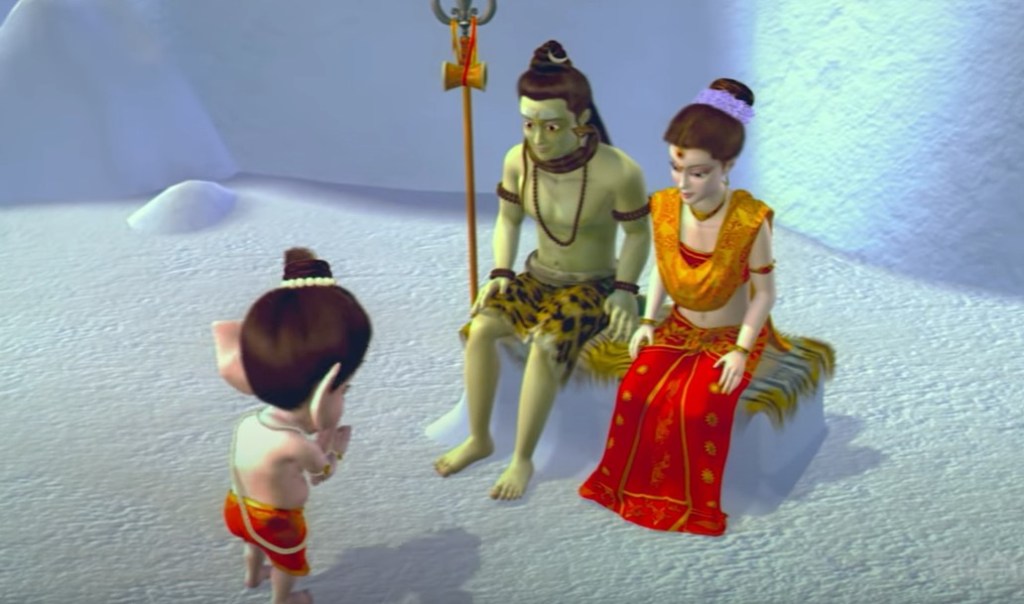 繞行完三界返回的戰神與繞行父母為三界的象神(印度兒童動畫截圖,根據著作權為合理的使用範圍)