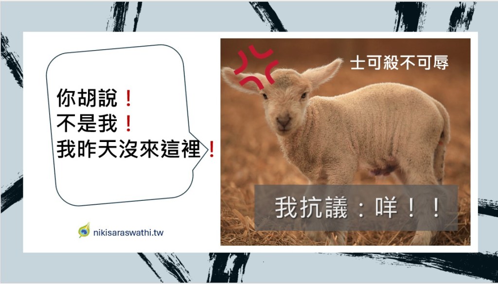 小羊一臉莫名,回答著:『我怎麼可能弄髒你的水?你在河流上方,我在下方耶!』