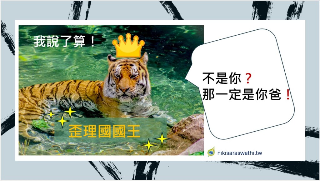 老虎變臉大吼道:『我才不管!反正一定是你阿祖、你阿嬤、你全家弄髒了我要喝的水!你要賠償!』