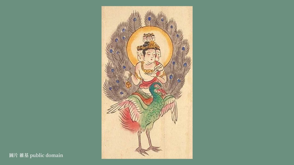 戰神在東亞風格畫作中的樣貌。儘管在不同地區,戰神名字都不相同,但孔雀座騎是一定要的。這張畫作也呈現戰神的六面形象。