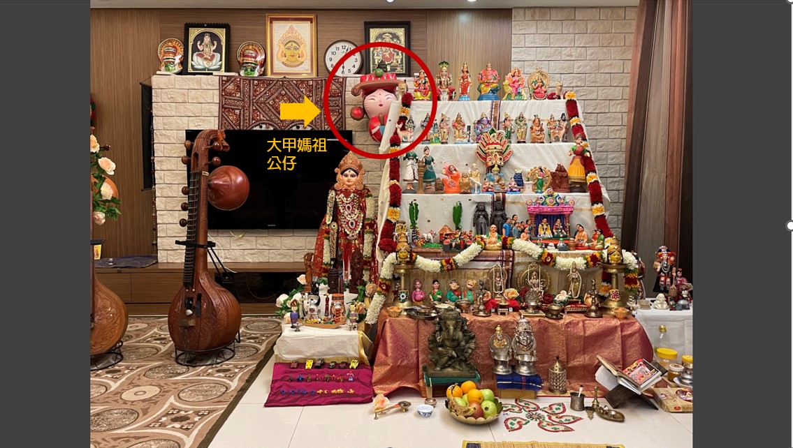 (右圖)向學生展示在臺灣生活的南印度友人,慶祝秋天的九夜節時,傳統上會擺設Golu 公仔娃娃。印度朋友入境隨俗,也擺設了臺灣的媽祖公仔,一起慶祝印度節慶。