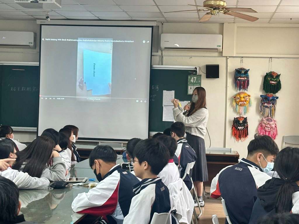 講座的尾聲,我們一起動手製作象徵兄妹情誼的印度手環 Rakhi。這是我與主辦老師黃維娣老師共同設計的文化體驗活動;再由學校的美術老師亞嫻,設計研發美勞材料包,並親自帶領學生製作。這款擁有圓形吉祥圖案的手環,是印度雨季期間的重要節慶——「兄弟姐妹節(Raksha Bandhan)」的核心象徵,代表著守護、祝福與深厚的情感連結。透過這個動手做的過程,學生們不只是理解了一個節慶習俗,更觸碰到文化背後的情感意涵,也為這場跨文化交流留下了具體而溫暖的記憶(可愛的學生還邀請我繼續留下來,吃過晚餐再回台北!)。