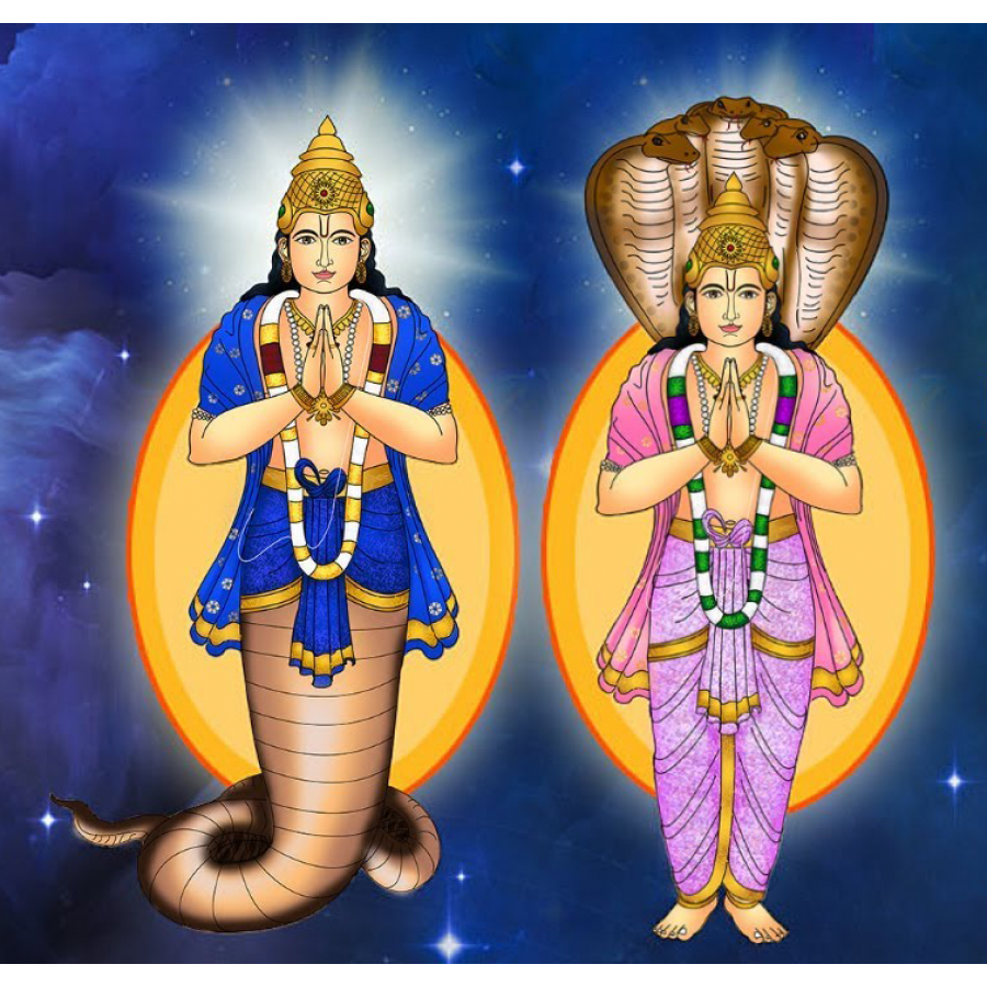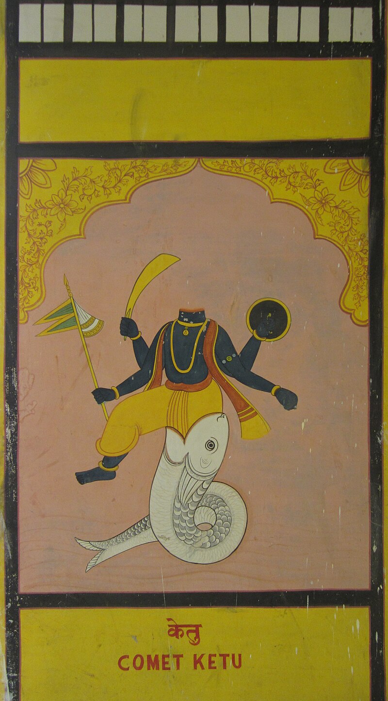 在神話裡,天神與阿修羅曾一同攪動乳海,欲取不死甘露。阿修羅天光(Svarbhanu)假扮成天神,偷偷喝了一口。太陽神與月神揭穿此舉,保護神-毗溼奴(Vishnu)立刻以法器神輪將其斬首。頭顱化為羅睺(Rahu,北交點),軀幹成為計都(Ketu,南交點)。