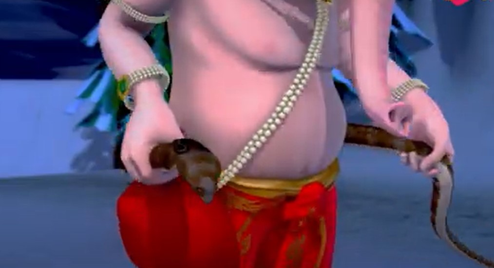 原來是象神迦尼薩(Ganesha)騎著小老鼠穆西卡(Mooshika),正滿身大汗地趕路。