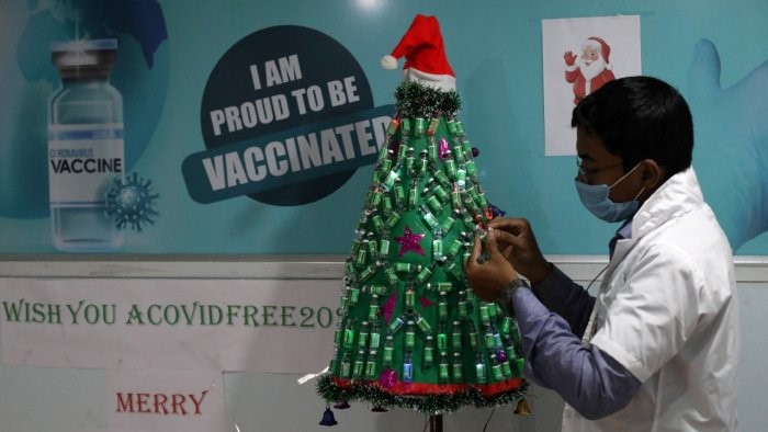 另外,直至今年2021年12月23日為止,據報導,印度全國接種Covid 19疫苗接種的覆蓋率,已經超過60%。在加爾各答,醫護人員用空瓶的 Covid-19 疫苗裝飾聖誕樹(2021)。
