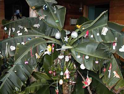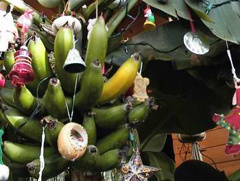 不同於常規以常青樹或松樹為聖誕樹的主要主體,在印度西部接近熱帶或南部熱帶的地方邦,如:果亞和喀拉拉邦等地,則出現了令人眼睛為之一亮的香蕉芒果聖誕樹!對這些溫暖的地區而言,較困難取得上述冷系樹木;反之,香蕉、芒果樹隨手可得!另外,這些植物也與當地居民的生活和傳統文化息息相關、緊密相連。也因此,對於印度人而言,充滿民族情感的香蕉樹、芒果樹自然也成了聖誕樹首選。香蕉在印度傳統文化中,不但也是神聖植物,也具有死亡後不斷的自我更新的神聖意涵。而芒果,則有多產、富饒之意。這些隱性的意涵,也讓印度獨樹一格的聖誕樹,為聖誕節帶來豐富多樣的精神信念。